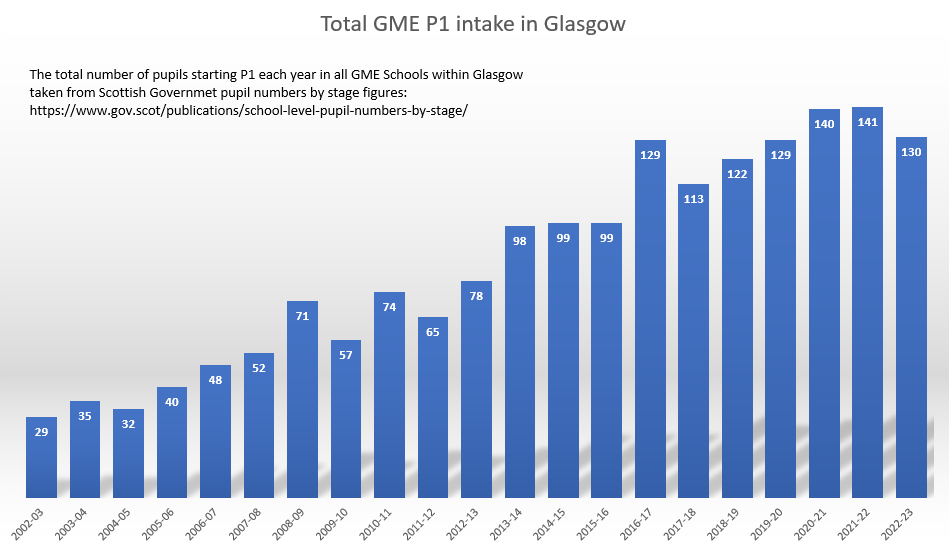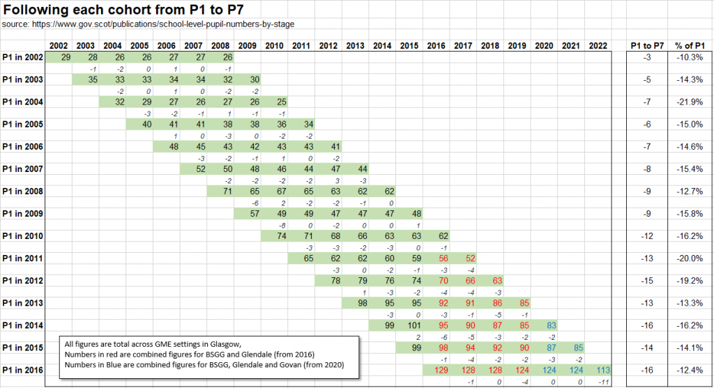 This table follows each cohort of P1 pupils through to P7 showing the difference in numbers each year. It should be noted that if 2 pupils leave and 1 joins this will be a net loss of 1 pupil, the actual number of children moving in or out of GME in Glasgow is not available.
